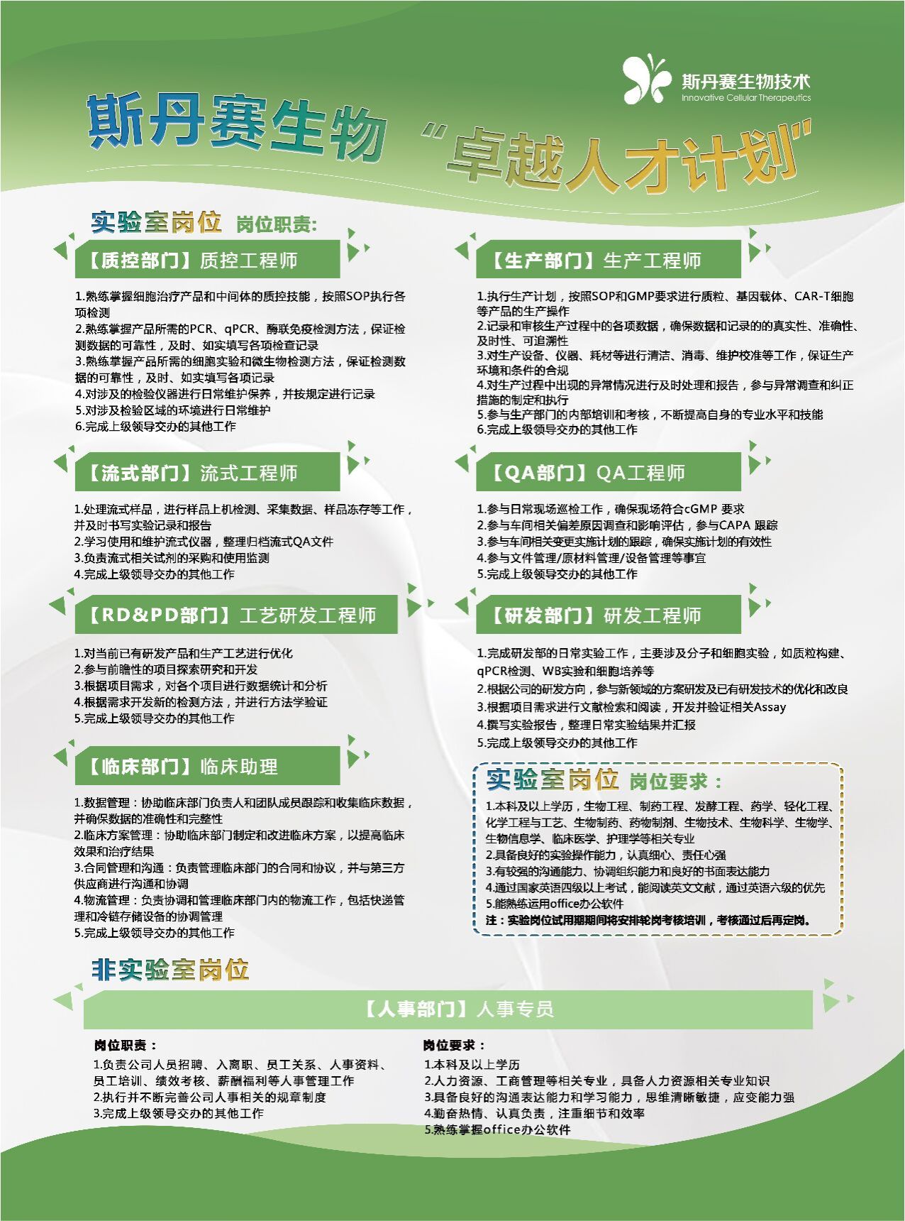【招聘岗位】生产工程师、质控工程师、流式工程师、工艺研发工程师、QA工程师、研发工程师、临床助理、人事专员