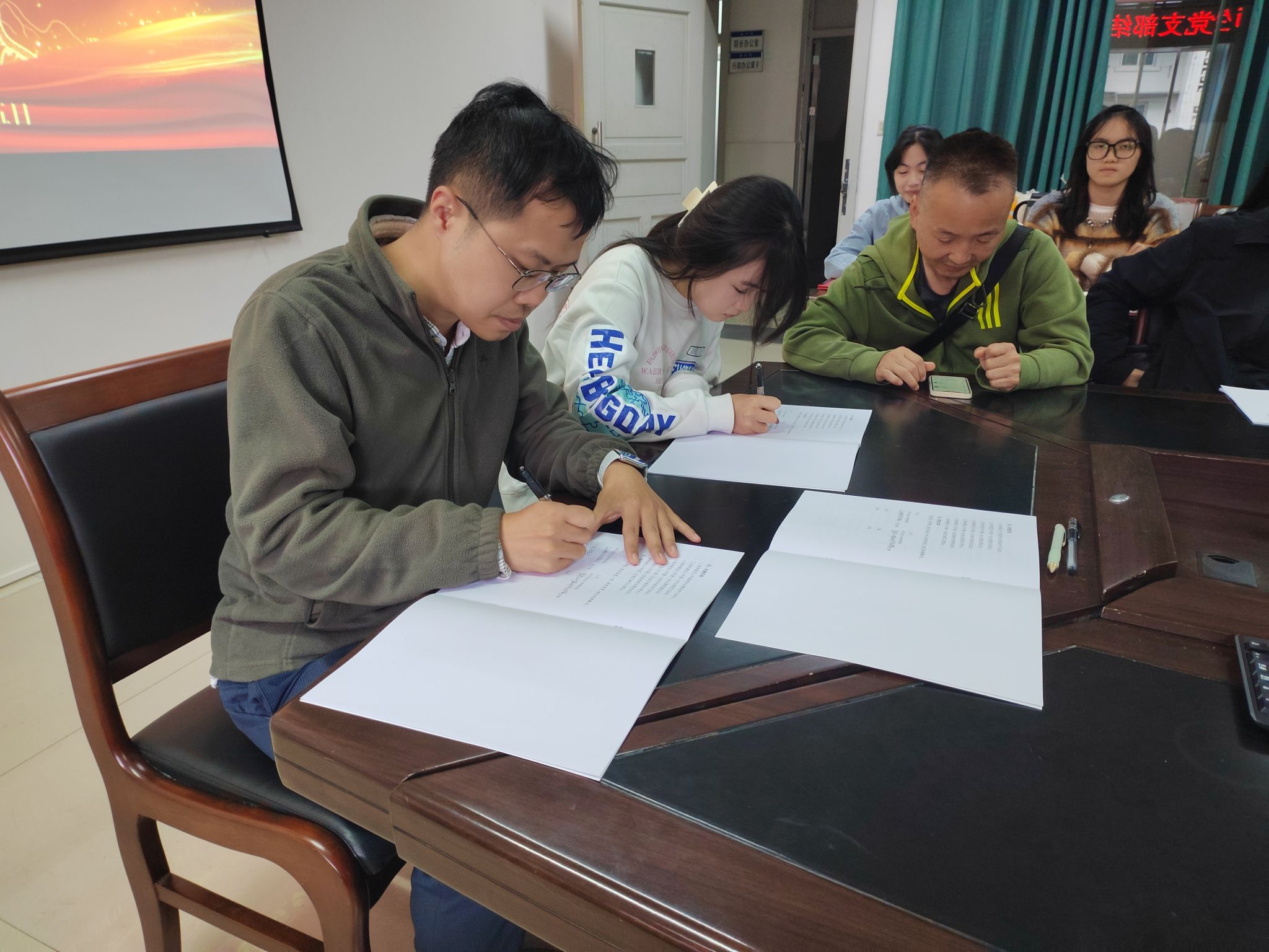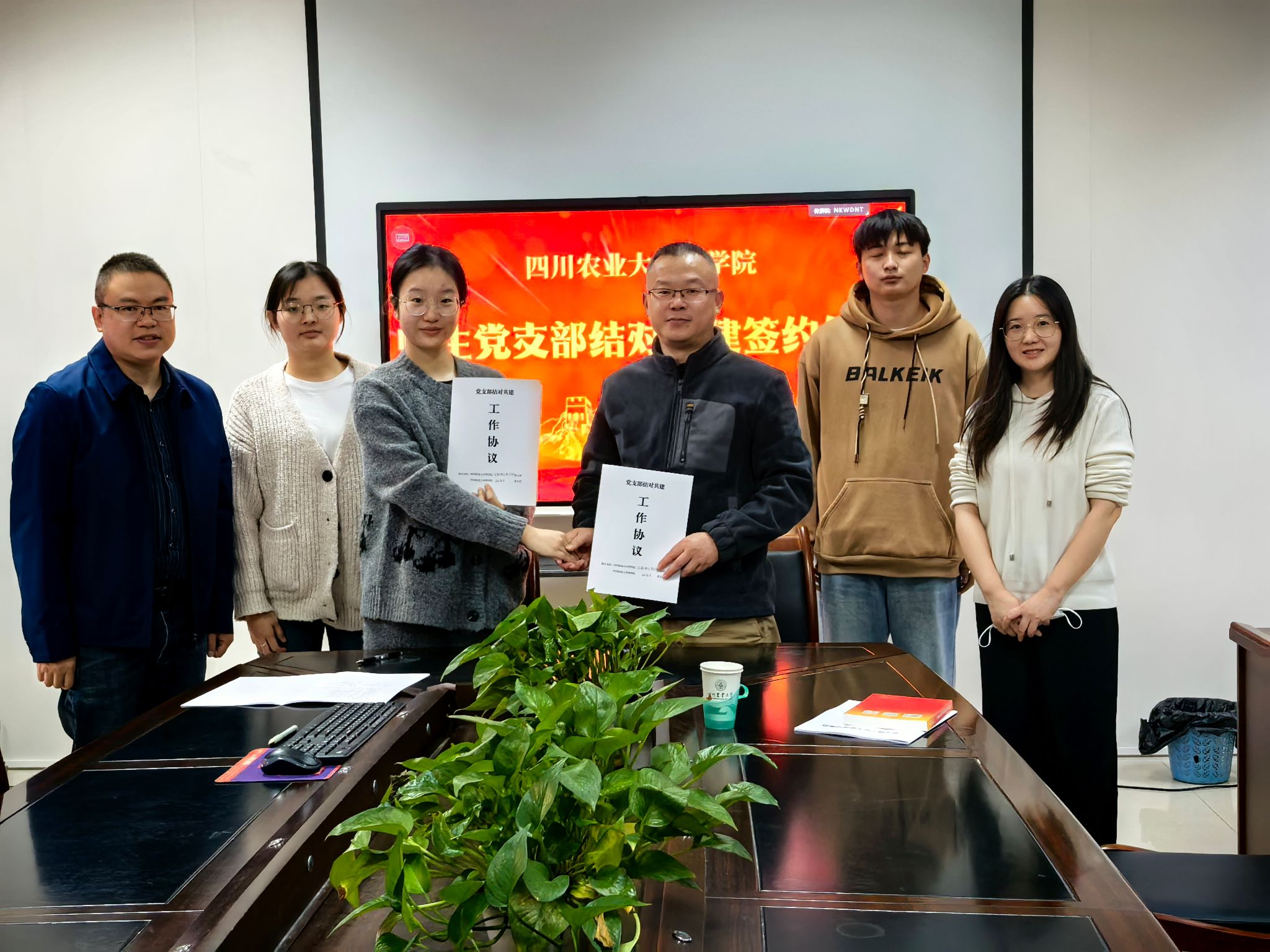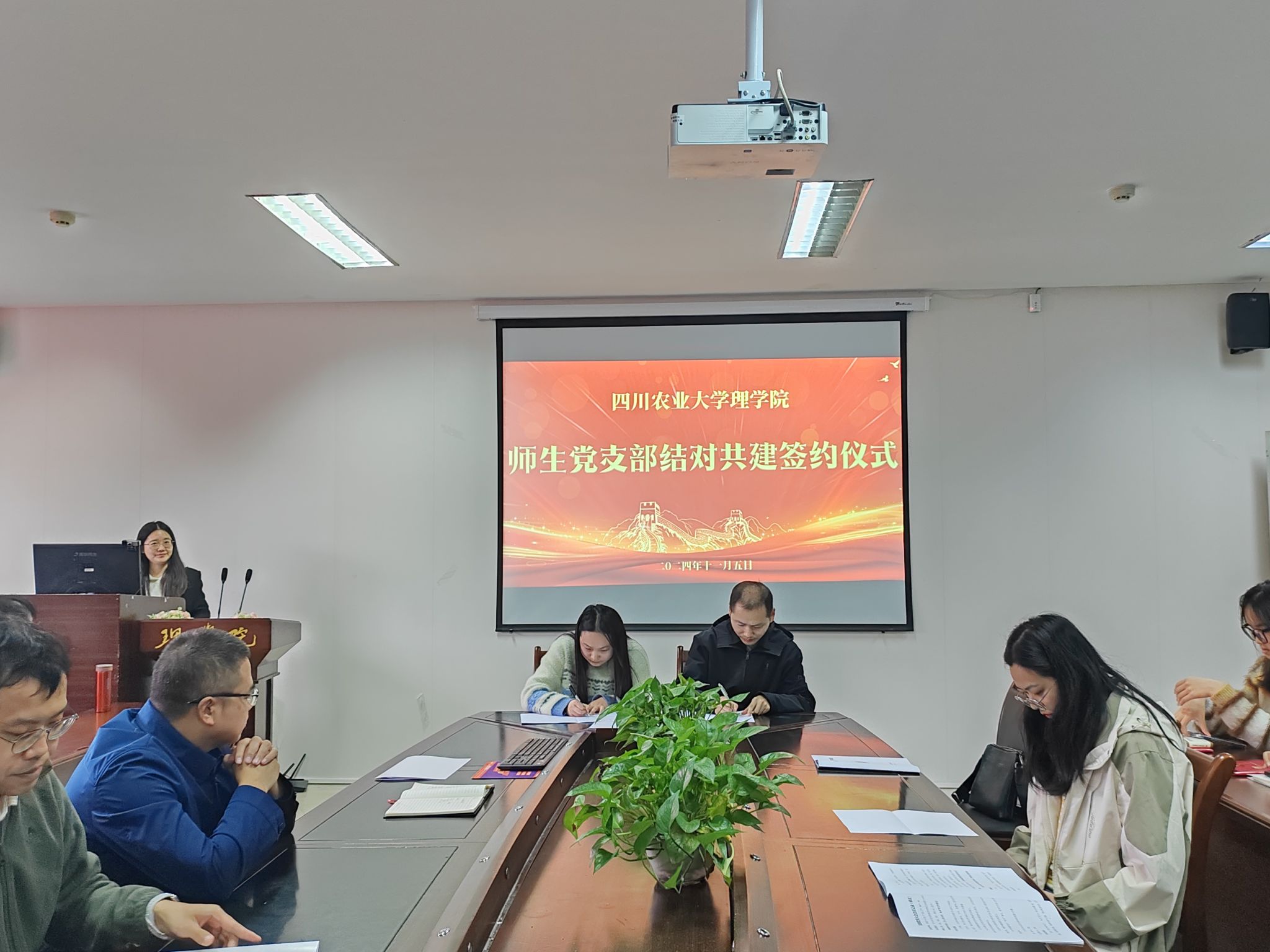 成都校区教学部党支部与研究生党支部、应用数学系教工党支部和信息与计算科学专业员工党支部、应用化学系教工党支部和应用化学专业员工党支部、化员工物学系教工党支部和化员工物学专业员工党支部在现场党员的见证下进行了支部共建签约。