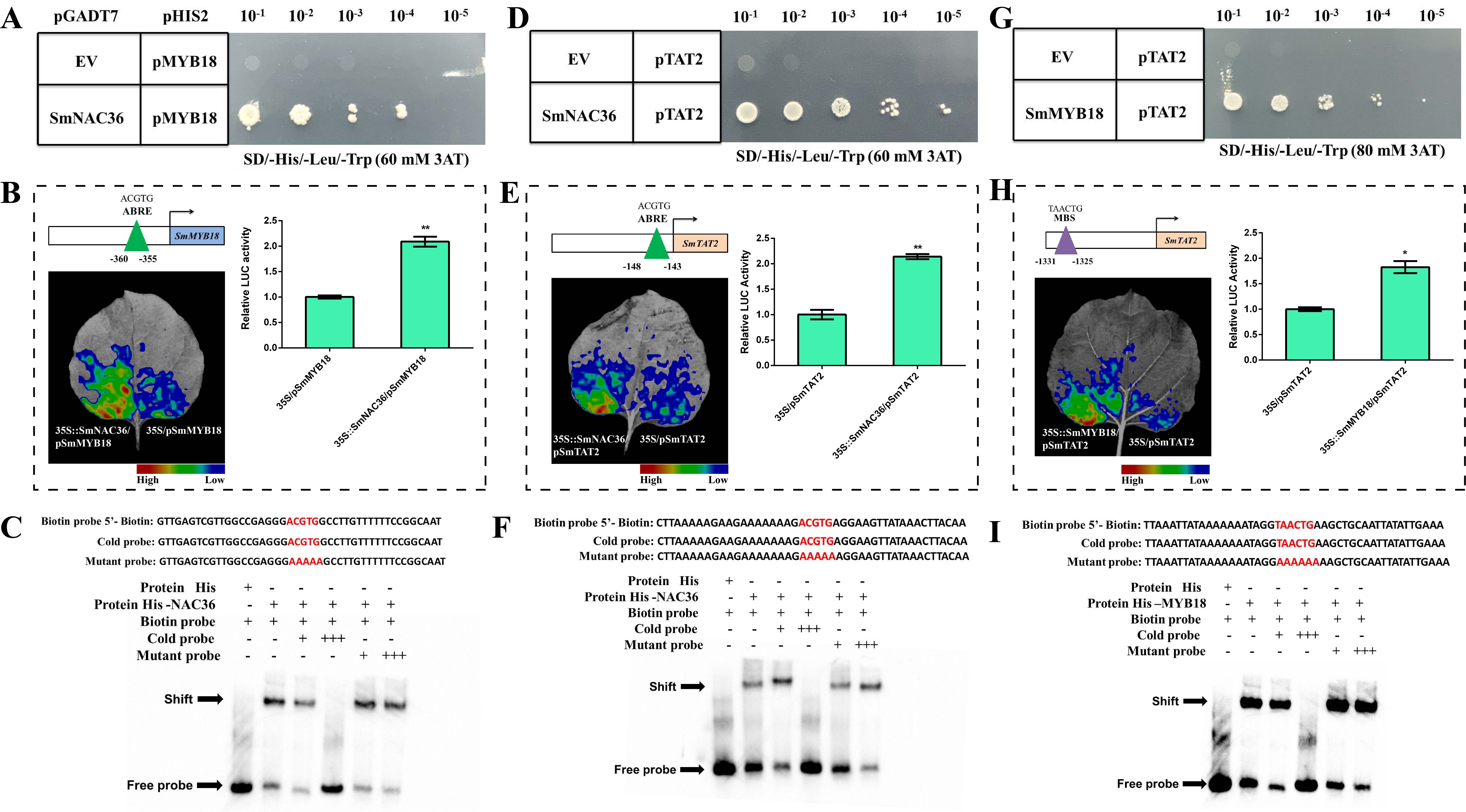丹酚酸(如丹酚酸B、迷迭香酸)是丹参中主要的水溶性活性成分,具有抗氧化、抗炎和保护心血管等药理活性,其生物合成途径的转录调控机制方面仍具有较大研究空白。研究团队基于前期构建的高质量丹参基因组数据库,通过转基因毛状根(过表达和CRISPR/Cas9基因编辑)结合RNA-Seq分析,筛选出与酚酸合成高度相关的转录因子SmNAC36和SmMYB18,并锁定酪氨酸氨基转移酶基因SmTAT2为核心靶标。进一步通过酵母单杂交、双荧光素酶报告系统及凝胶迁移实验证实,SmNAC36可直接结合SmMYB18和SmTAT2启动子区的ABRE元件,激活其转录;而SmMYB18通过结合SmTAT2启动子的MBS元件,形成“NAC36→MYB18→TAT2”级联调控通路。此外,过表达SmNAC36的毛状根中,迷迭香酸和丹酚酸B含量分别提升3.66倍和7.02倍,显著高于单独过表达SmMYB18或SmTAT2的效果,表明该调控网络具有“叠加放大效应”。研究团队还发现,SmTAT2编码的酪氨酸氨基转移酶对底物L-酪氨酸具有高亲和力(Km=1.23 mM),表明其在酚酸前体4-羟基苯丙酮酸(HPP)合成中的核心地位。通过CRISPR/Cas9敲除SmTAT2后,毛状根中HPP、迷迭香酸和丹酚酸B含量分别下降68%、52%和74%,进一步验证了其功能。此项研究进一步解析了丹参酚酸合成的转录调控网络,不仅为丹酚酸代谢工程与合成生物学研究奠定了理论基础,还为丹参分子设计育种提供了新靶点。