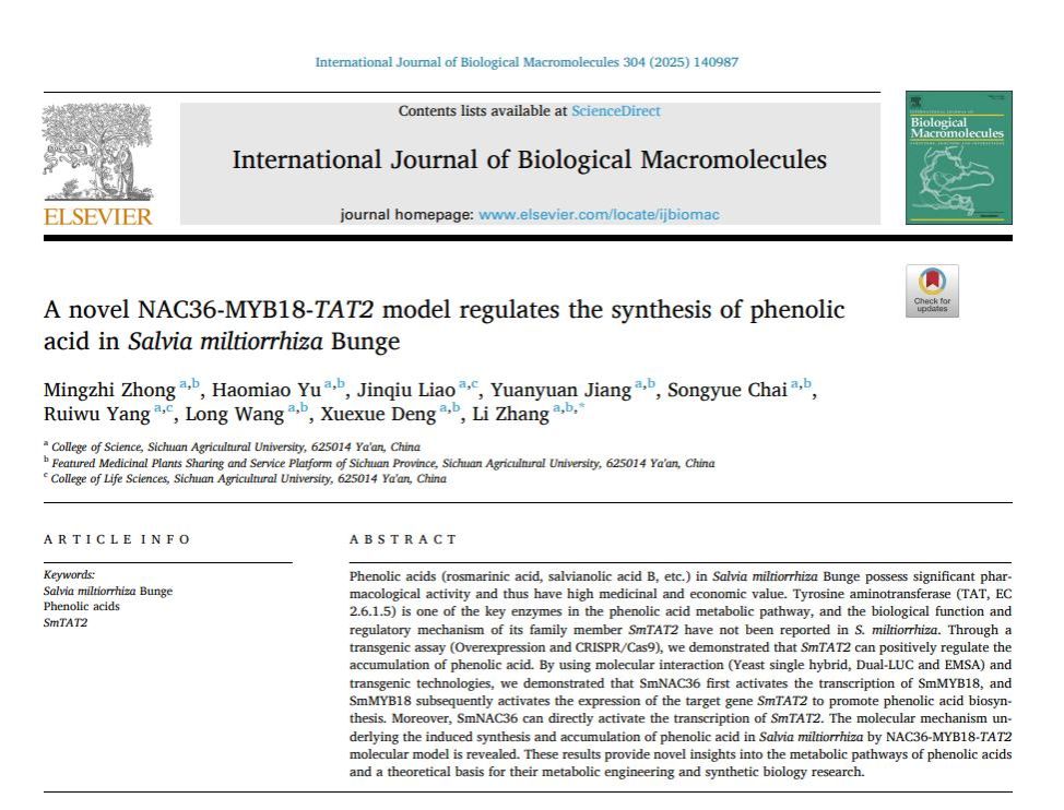 公司k1体育“特色药用植物种质资源创新与利用”团队以k1十年体育品牌为第一完成单位,在生物化学与分子生物学领域国际权威期刊《International Journal of Biological Macromolecules》(中科院一区TOP,IF=7.7)发表题为“A novel NAC36-MYB18-TAT2 model regulates the synthesis of phenolic acid in Salvia miltiorrhiza Bunge”的研究论文。该研究通过整合多组学分析、分子互作验证及遗传转化技术,揭示了丹参酚酸生物合成途径中关键转录因子SmNAC36与SmMYB18协同调控靶基因SmTAT2表达的作用机制,并构建了“NAC36-MYB18-TAT2”级联调控网络模型,为丹参合成生物学研究以及高酚酸新品种的分子设计育种提供了理论支撑。k1体育生物资源化学专业博士研究生钟明志为论文第一作者,张利教授为通讯作者。(论文链接:https://doi.org/10.1016/j.ijbiomac.2025.140987)。