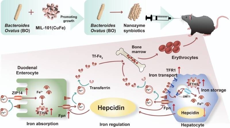 缺铁性贫血是全球最常见的营养性疾病之一,严重影响人类的健康水平。在动物营养领域,缺铁性贫血也是畜禽养殖中常见的问题,尤其在幼龄动物(如仔猪、仔鸡等)中较为常见,会导致生长发育迟缓、免疫力下降等问题,进而影响养殖效益。目前常用的铁剂补充疗法在人类和动物营养中均存在吸收率低、消化系统副作用大等局限,急需开发更加高效、安全的新型治疗手段。本研究围绕“益生菌 + 益生元 + 纳米酶”协同作用展开,以卵形拟杆菌(Bacteroides ovatus, BO)为基础,在铜铁双金属纳米酶 MIL-101(CuFe) 作用下构建“纳米酶合生元(CuFeBO)”的创新治疗策略。研究结果表明,BO 通过上调十二指肠铁转运蛋白 ZIP14 及铁输出蛋白 Fpn 的表达,有效促进肠道铁吸收;同时,上调肝脏转铁蛋白受体 TFR1 和铁蛋白亚基 FTH/L 的表达水平,增强体内铁的转运与储存功能。此外,BO 还可下调肝铁调素(Hepcidin)的表达,从而维持 Fpn 的持续功能,优化体内铁稳态。在此基础上,研究团队合成的 MIL-101(CuFe) 纳米酶不仅具备类谷胱甘肽过氧化物酶(GPx)活性,表现出优异的抗氧化、抗炎特性,同时可作为益生元显著促进 BO 的生长活性(提升超过3倍)。BO 与 MIL-101(CuFe) 联合使用后形成的 CuFeBO 纳米酶合生元,在铁吸收(Fpn)、转运(TFR1)与储存(FTH/L)通路上实现多靶点协同调控,在动物模型实验中表现出明显的贫血缓解效果。