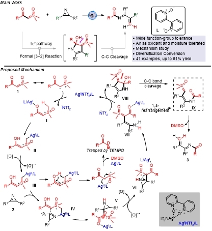 该研究成果介绍了银(I)/联吡啶氮氧配合物催化的2H-氮丙啶与α-羰基亚砜叶立德间的碳-碳键断裂/重组反应,能够将亚胺片段直接插入到了非张力碳-碳键中,快速构建一系列通过常规方法难以获得的α,β-不饱和亚胺类化合物。此外,该反应可以进行克级规模合成,并且所得产物能够发生还原、氧化、加成、双功能化等多种类型的反应。这一研究不仅进一步丰富了2H-氮丙啶化学,还为碳-碳键的断裂重组研究提供了新思路。