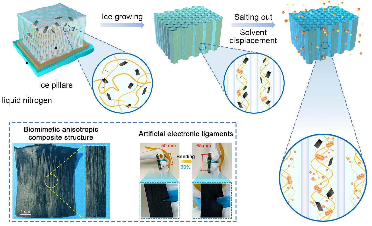 随着机器人与人工智能技术的蓬勃发展,研发模拟人体组织特性的仿生材料成为关键。然而,传统的聚合物水凝胶材料力学性能薄弱、功能单一,难以满足实际需求。近日,k1体育与四川大学高分子国家重点实验室的周涛教授团队开展合作,受天然生物材料层级各向异性结构启发,研发出一类制备全天候强韧耐疲劳的复合有机水凝胶的通用策略,为电子人工韧带等前沿应用开辟新路径。