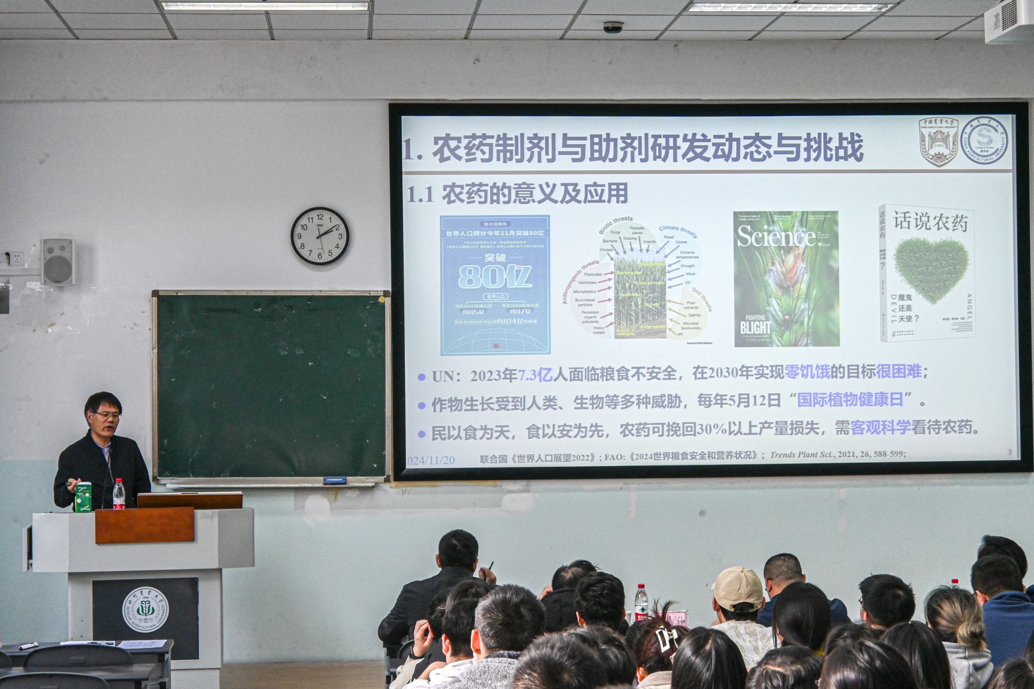 杜凤沛教授围绕全球粮食安全、人类可持续发展以及我国农业绿色高质量发展的重大战略需求,剖析了农药制剂与助剂的研发趋势,明确了施药场景的典型特征,并创造性地提出了基于场景导向的研发策略。结合自己团队在纳米农药高效递送体系研发中的经验,分享了理农交叉融合在解决我国农业重大问题中的实践成果。杜凤沛教授的报告内容丰富,知识深厚,由浅入深,层层递进,理论联系实际。同时为多位老师和员工解答了关于纳米农药的市场潜力和科研成果转化模式等方面的疑惑,现场学术氛围热烈。